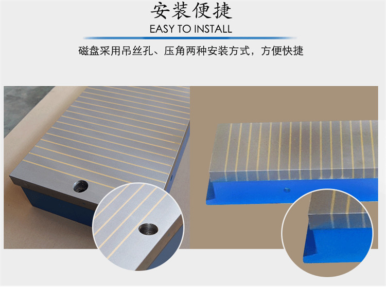 矩形电磁吸盘两侧有装螺孔,在安装时拧入T形螺钉装,用T形块和螺钉固定在工作台上,接通机床上的直流电源和地线,然后将吸盘上平面精磨,以上平面对底面的平行度。