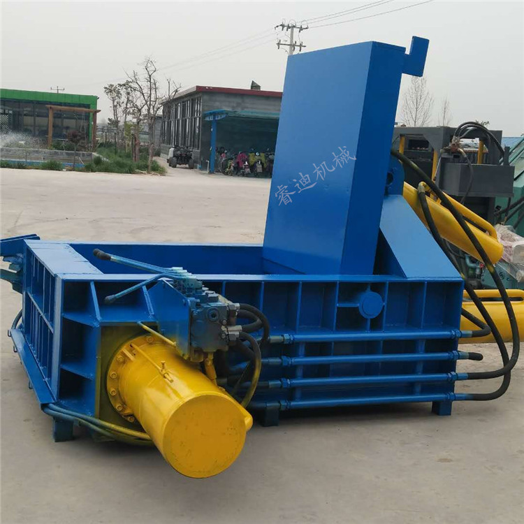 将打包物料置于打包机料箱内,液压油缸工作打压,将打包物料压缩成型,压制成各式金属包块