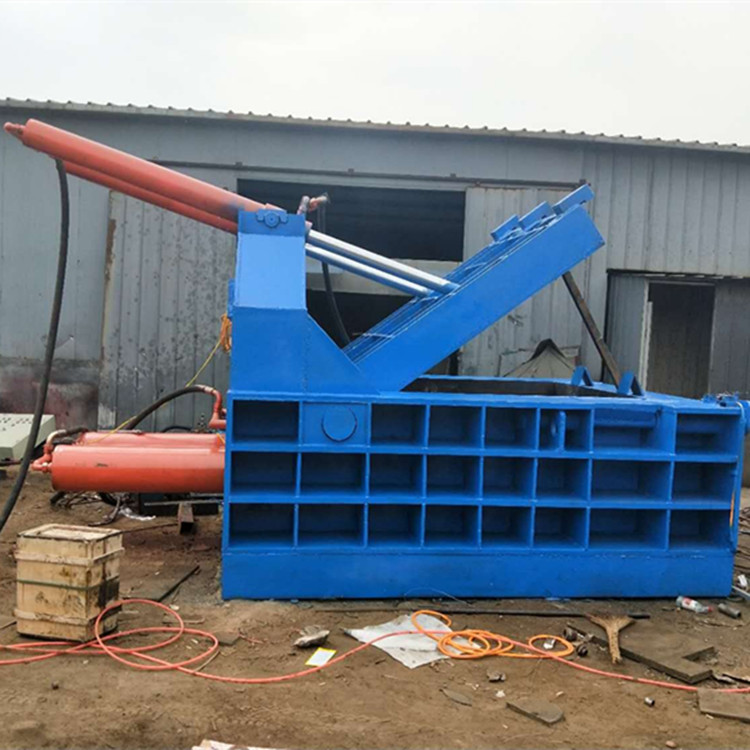 将打包物料置于打包机料箱内,液压油缸工作打压,将打包物料压缩成型,压制成各式金属包块