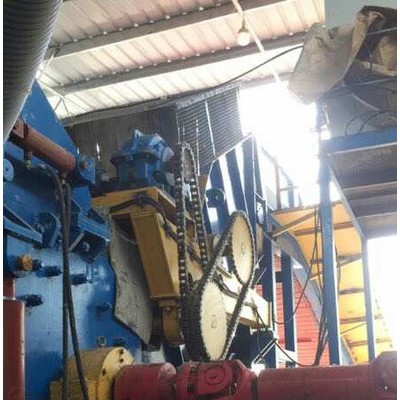 上料链板式输送机输入的废钢经过35。~40。倾角的溜槽和双液压滚筒进入破碎机。由于不同的物料特性,有些外形庞大的物料不能直接进入主机,需要双液压滚筒的预压,进一步提高其初密度,这样就保证了破碎料的成品质量。一旦破碎机工作电流过大,就需要降低压辊高度,控制废钢输入速度,保证破碎机的连续高效工作。当压辊油缸处于初始位置时,压辊处于低位置;当油缸工作全行程时,压辊处于高位置。本公司生产的双液压辊采用合金材料制作,耐磨性好、使用寿命长。